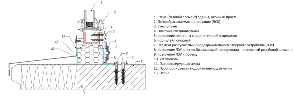 Наши легкосбрасываемые оконные конструкции (ЛСКО) имеют предохранительные запорные устройства (ПЗУ) в виде разрушаемых элементов крепления, освобождающих смещаемый элемент при воздействии на него избыточного давления.